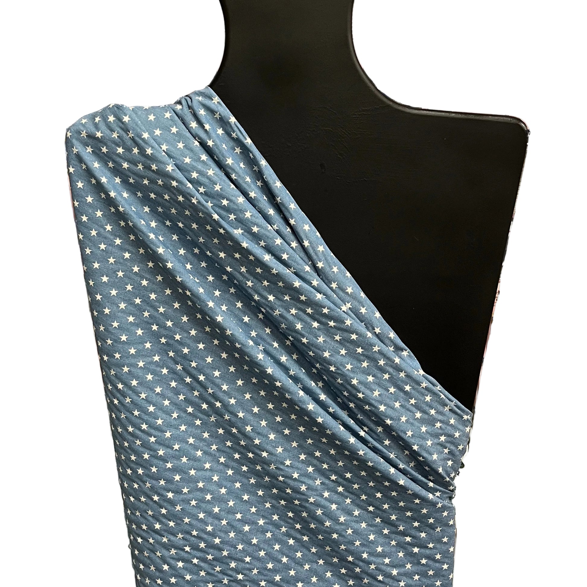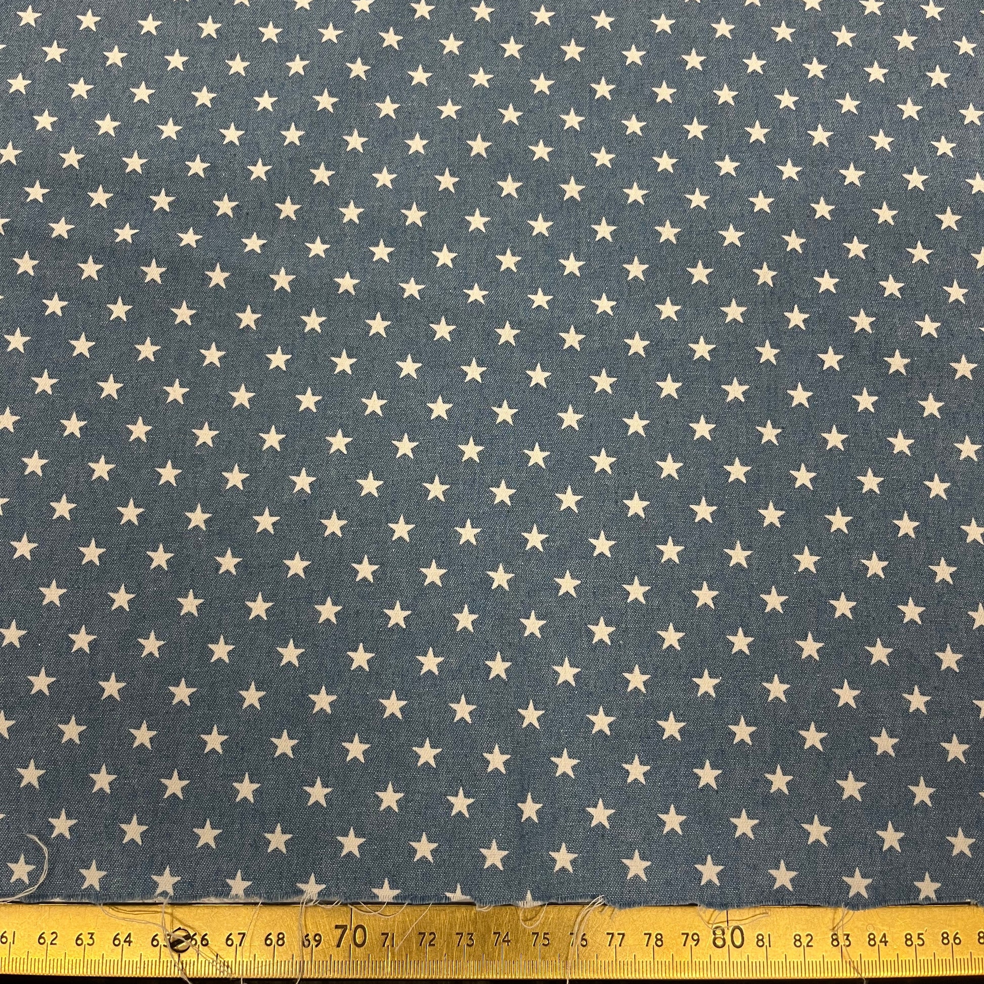 Light in colour and weight. White stars on light denim. Lovely soft drape.